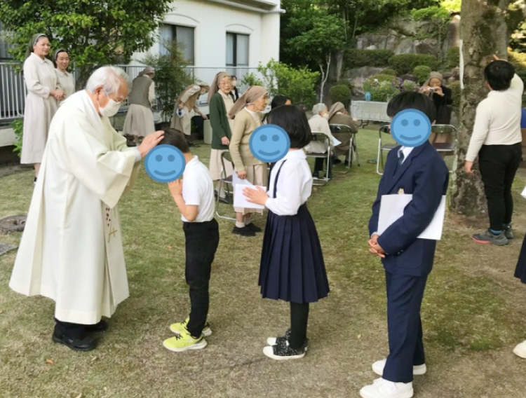 五月マリア祭で神父様から祝福を受ける