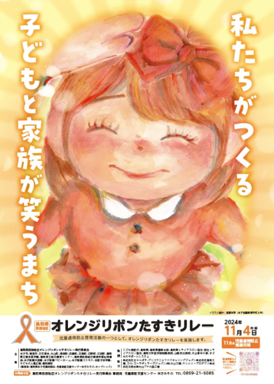 毎年秋には子育て応援講演会と、『子どもたちに明るい未来を』を合言葉に鳥取県西部地区オレンジリボンたすきリレーを開催しています。また、地元の高校生がデザインをしたポスターを作成し、子どもたちが健やかに地域で成長できるよう啓発活動に取り組みました。